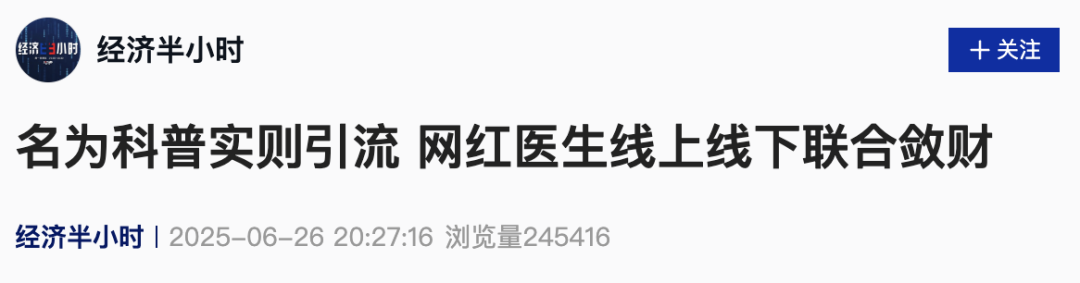 6月26日,“央视财经”曝光部分网红医生乱象:线上引流,线下高价开药。